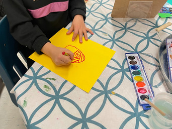School-age created abstract egg creatures using various facial components and limbs. As well as creating watercolour resist Easter eggs, drawing inspiration from the Ukrainian “Pysanky” eggs for Easter.