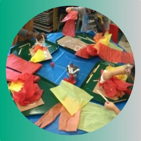 Here, Preschool 2 Classroom celebrated Persian New Year by jumping over fire which they created out of red, yellow and orange tissue.