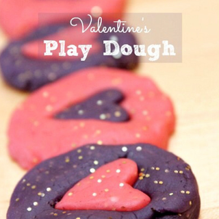 Quick and easy Valentines playdough! Kids love hands-on play and best of all it is great fun for toddlers to preschoolers and beyond. Set out a tray with lots of different materials such as stampers, rolling pins, cookie cutters, glitter, pom poms, cutout hearts, etc. for creating and exploring with this Valentines play dough. This recipe is easy to make, and very similar to store bought Play Doh.